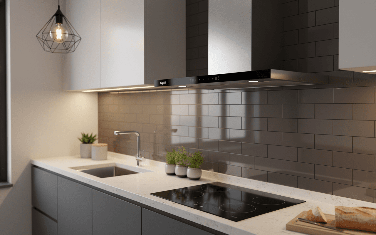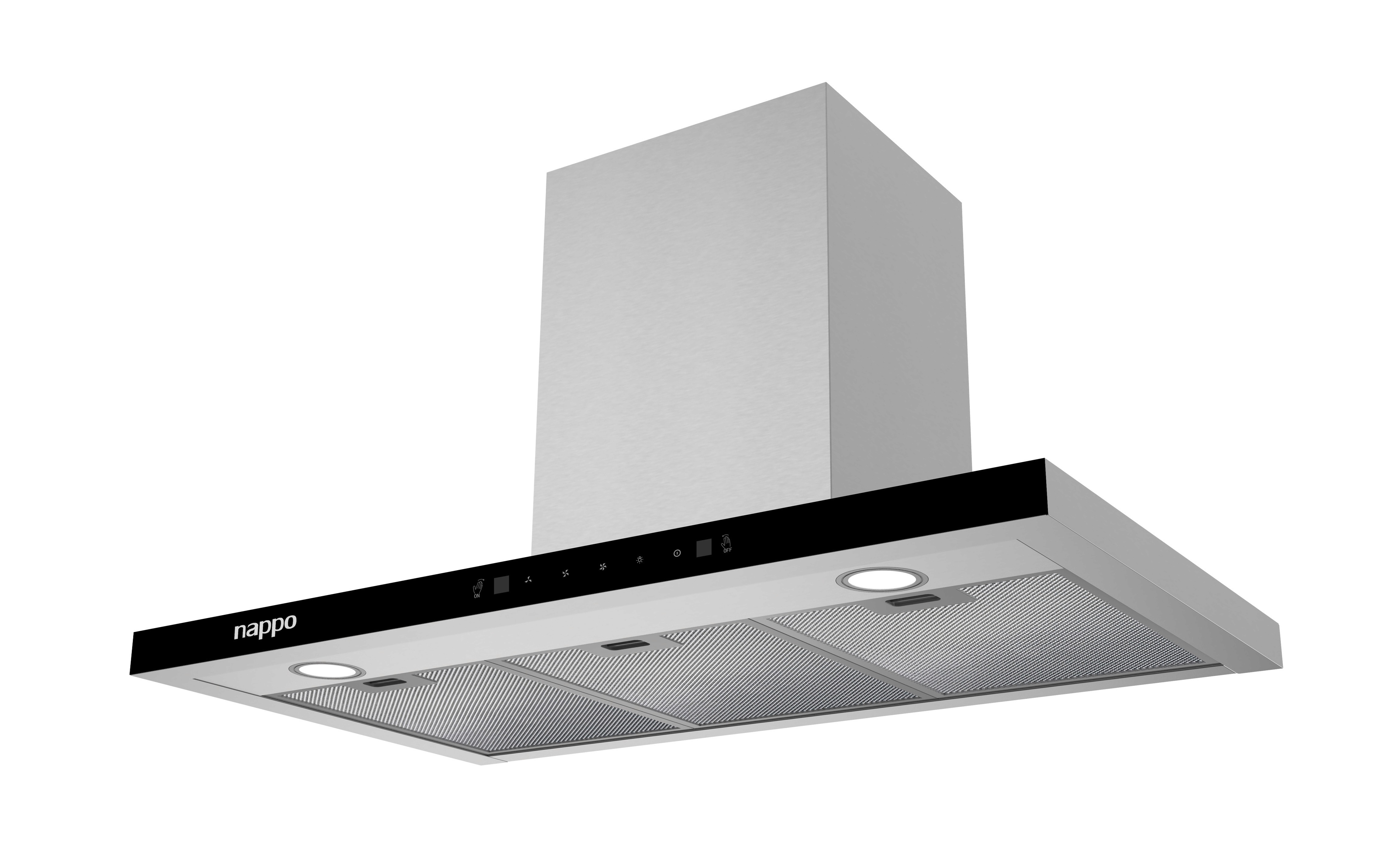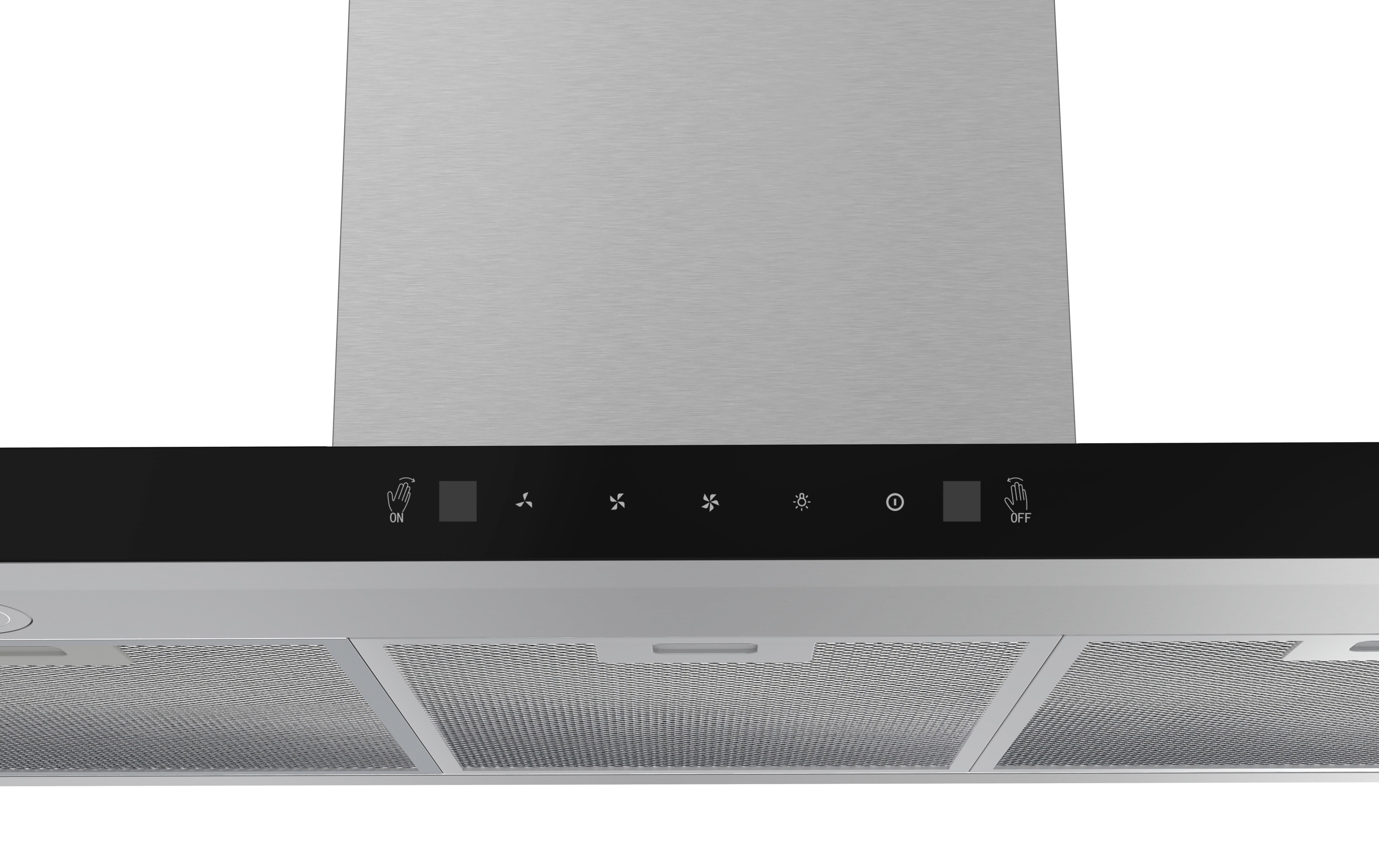 Diseño premium de 90 cm en acero inoxidable con vidrio curvo, panel táctil y control por gestos para una cocina moderna, potente y sofisticada.