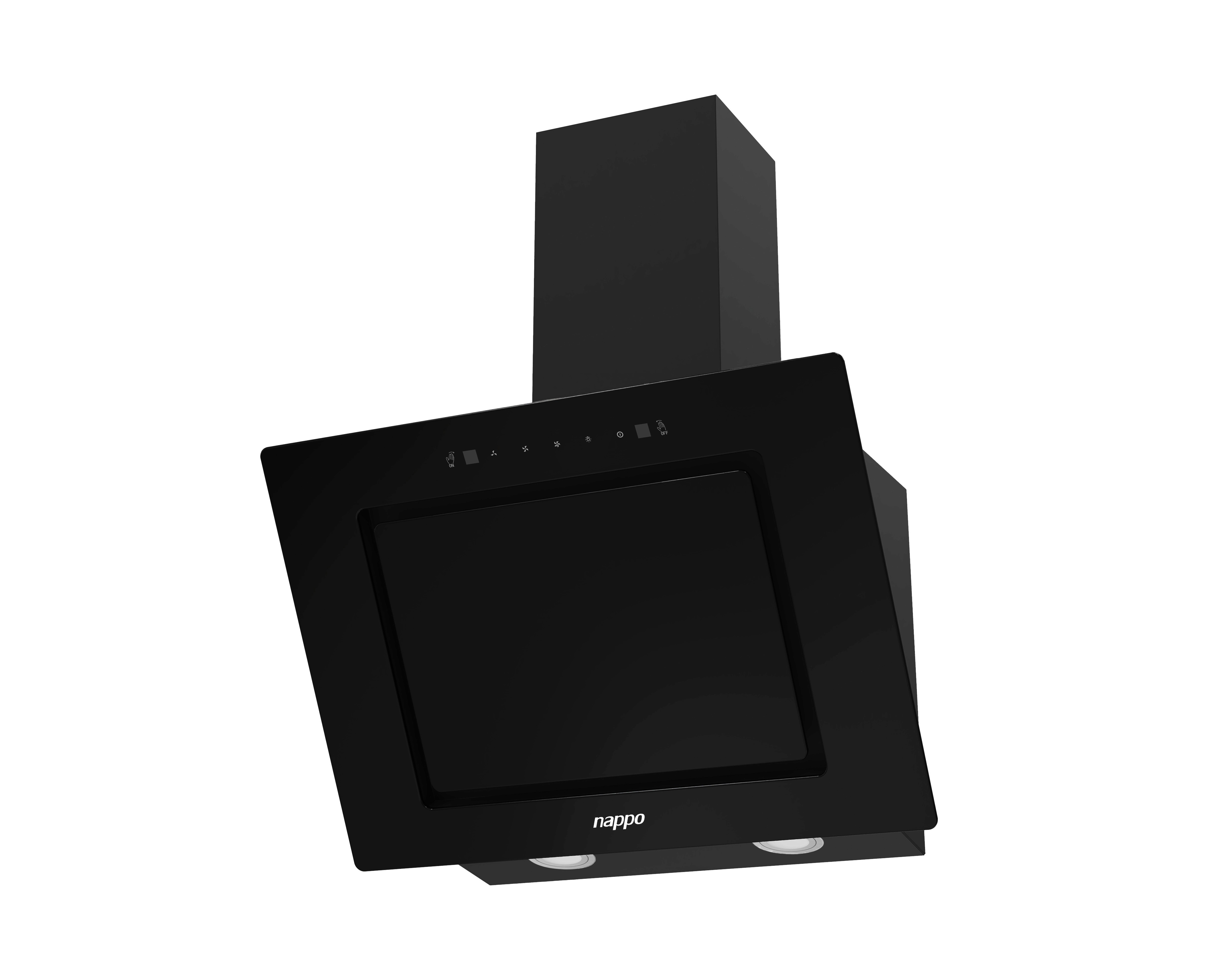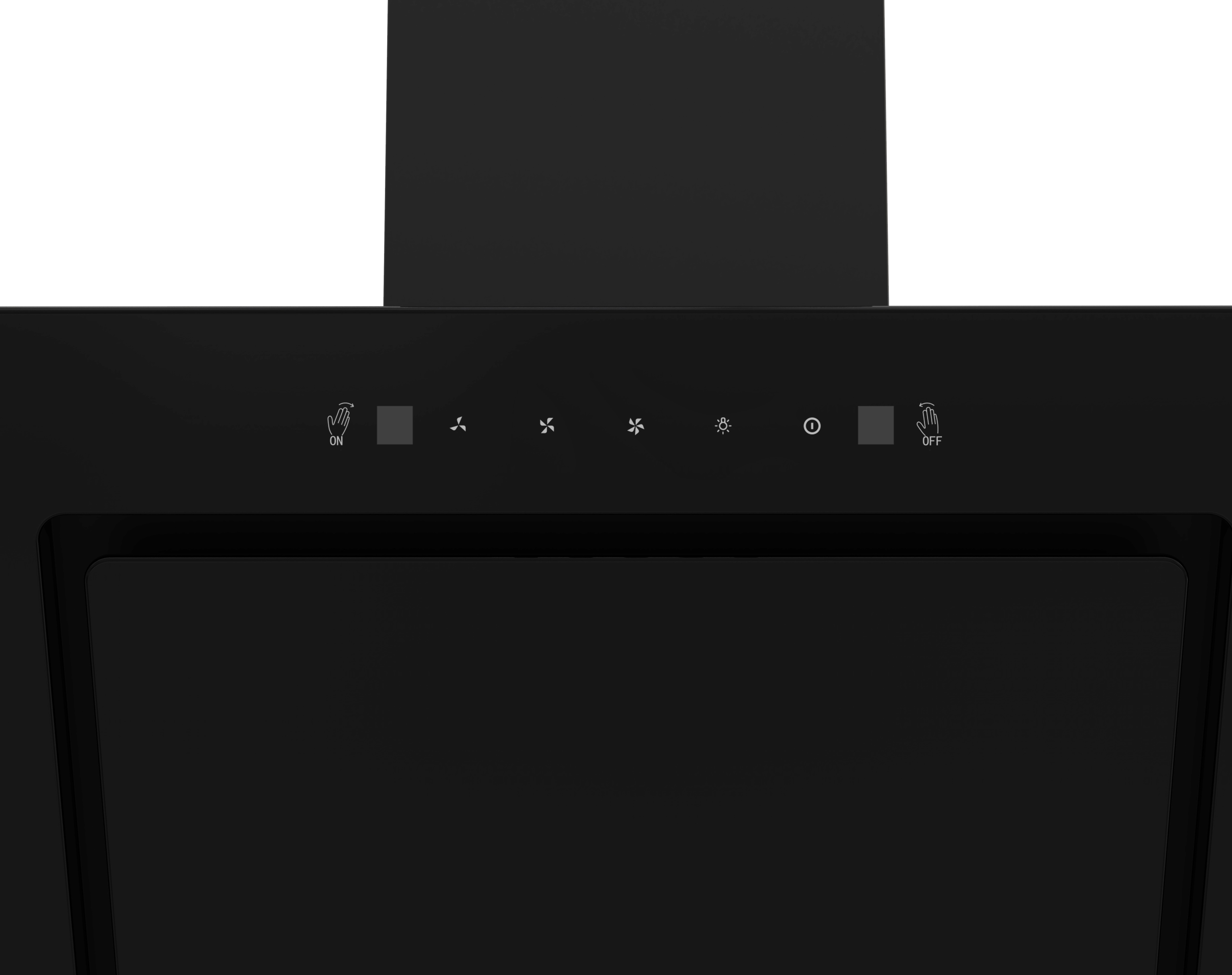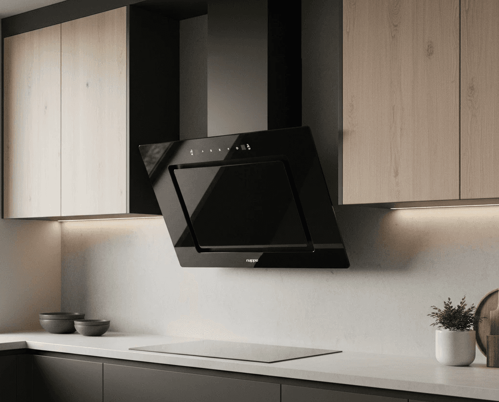 Campana extractora con diseño moderno en vidrio negro, control táctil intuitivo y control por gestos. Máxima potencia de extracción con estilo y tecnología para tu cocina.