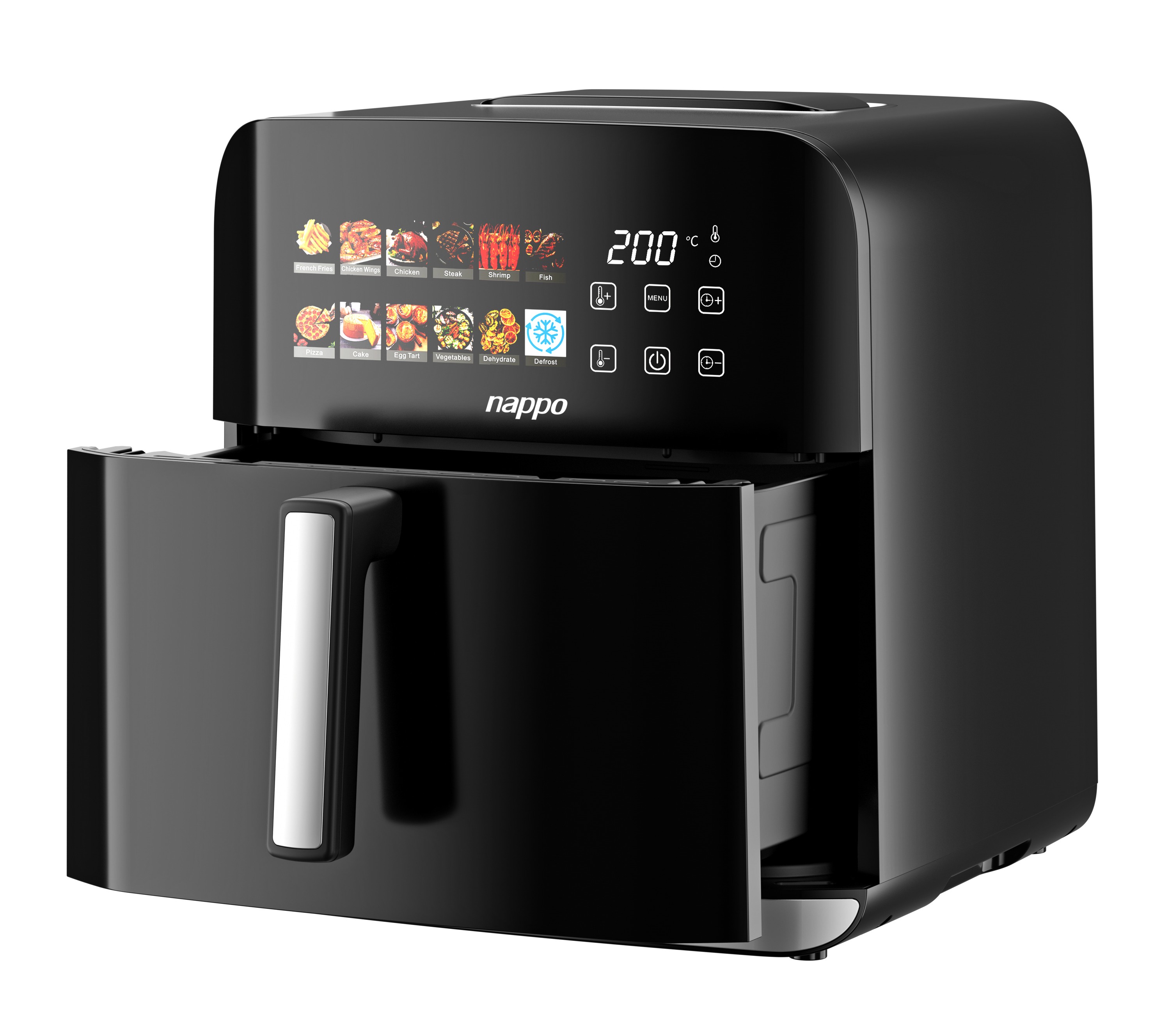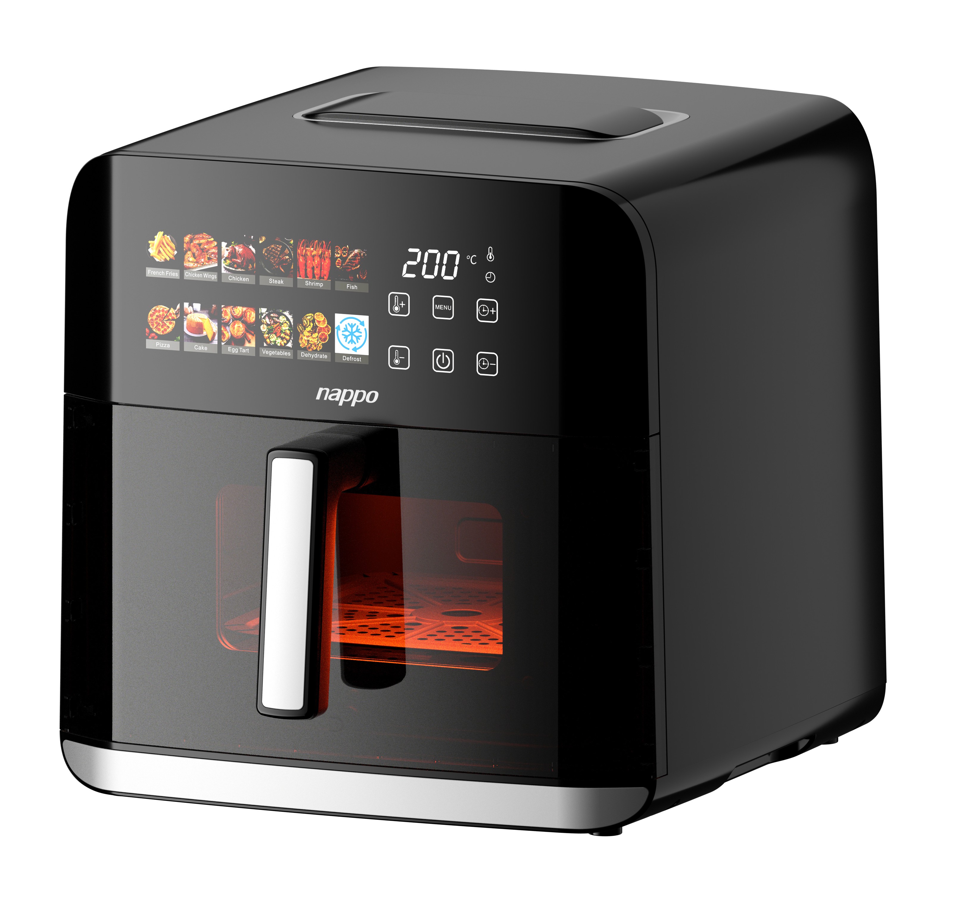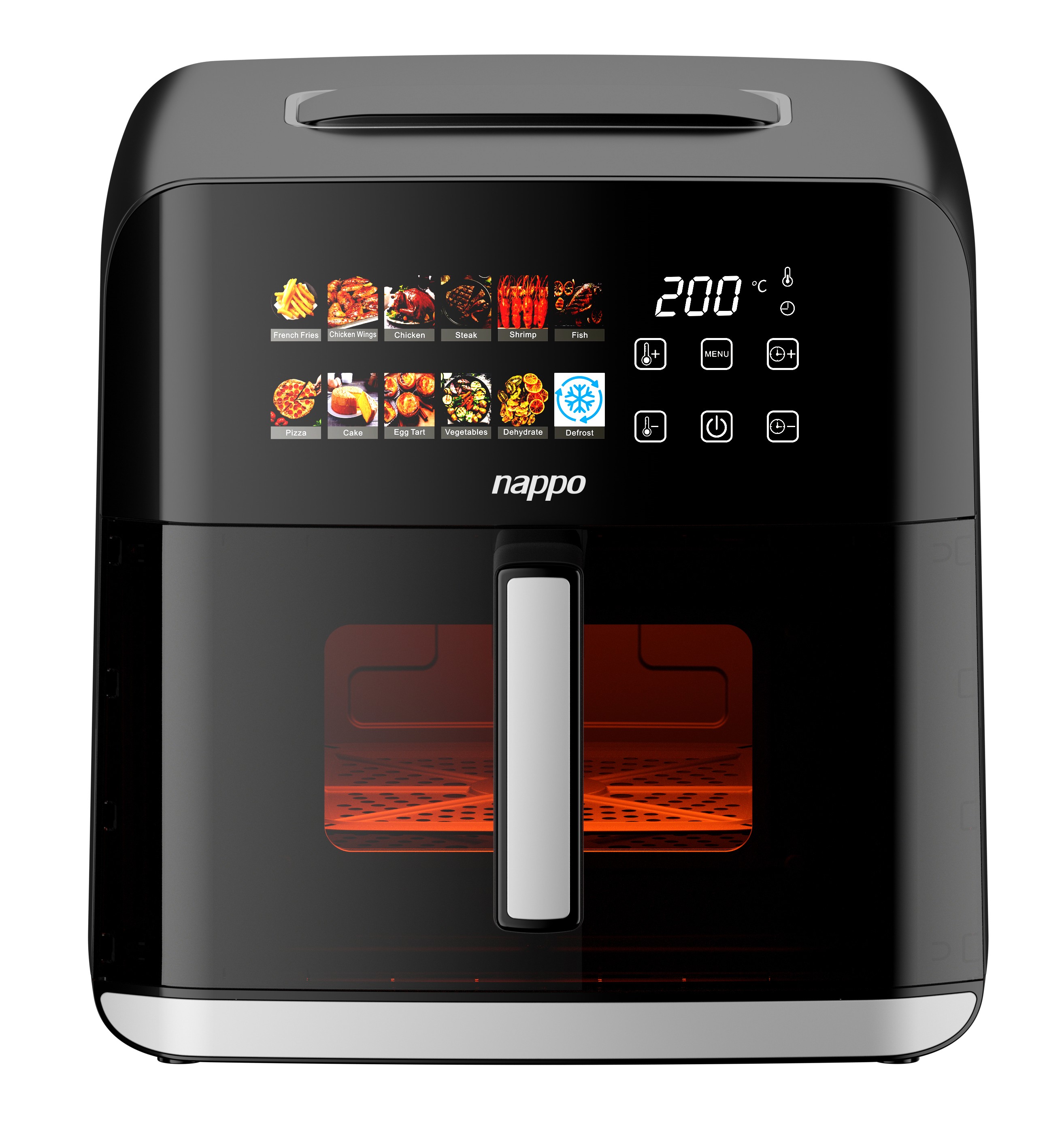 6 botones táctiles: Temporizador -, Temporizador +, Temperatura +, Temperatura -, Encendido / Inicio / Pausa, Menú.