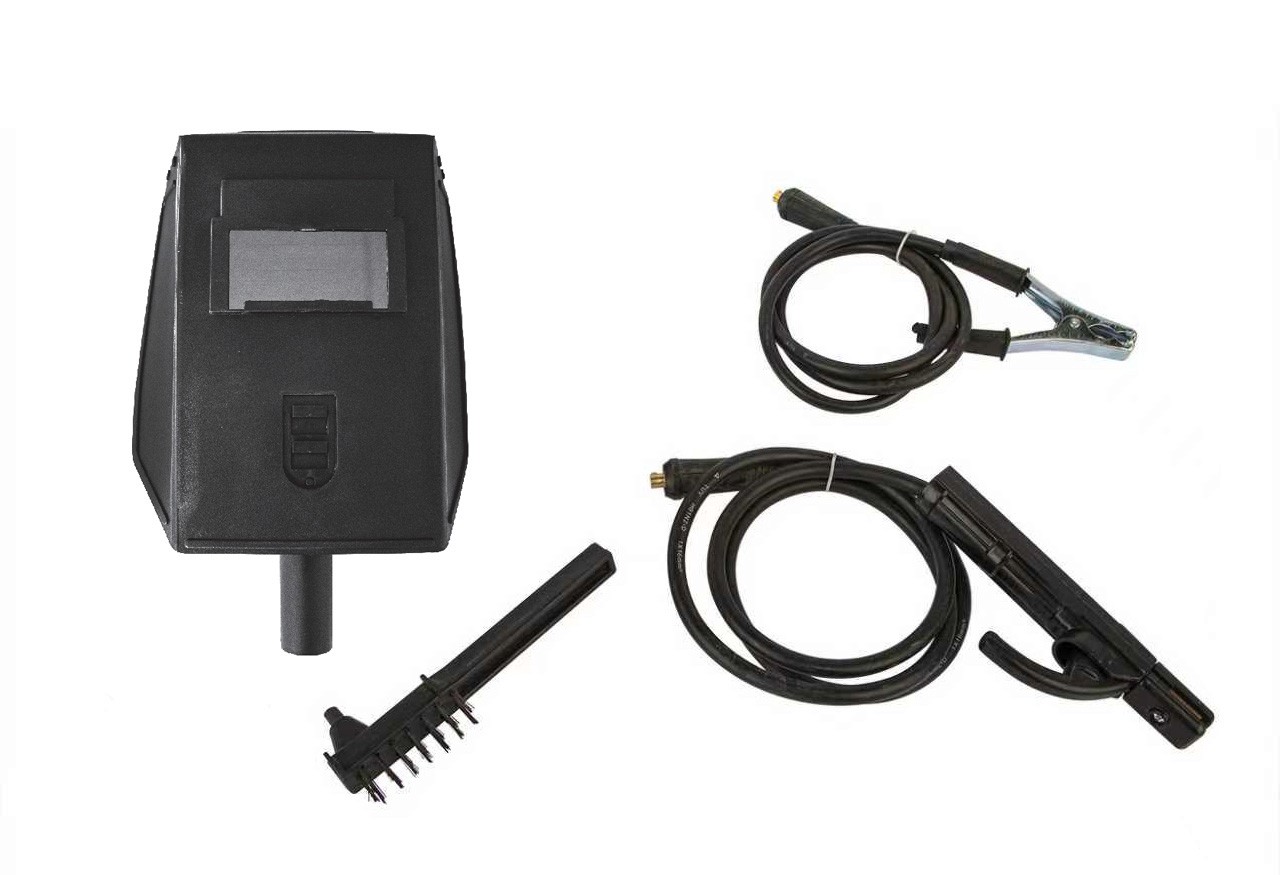 Accesorios incluidos: Porta electrodos 200A (con cable de soldadura de 1.8m, 3G1.0mm2), Pinza de tierra 200A (con cable de tierra de 1.2m), Máscara con pantalla de soldadura (de cristal negro), Cepillo de alambre / Martillo (para una operación más segura).