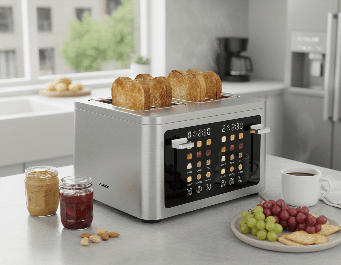 Tostadora cuádruple de alta potencia con doble display táctil a color para un control preciso e independiente. Diseño moderno, múltiples tipos de pan y niveles de tostado para resultados perfectos todos los días.