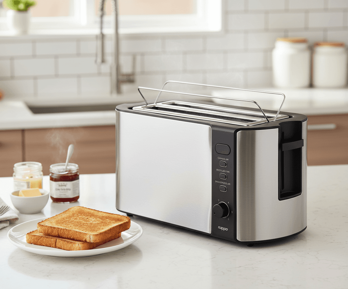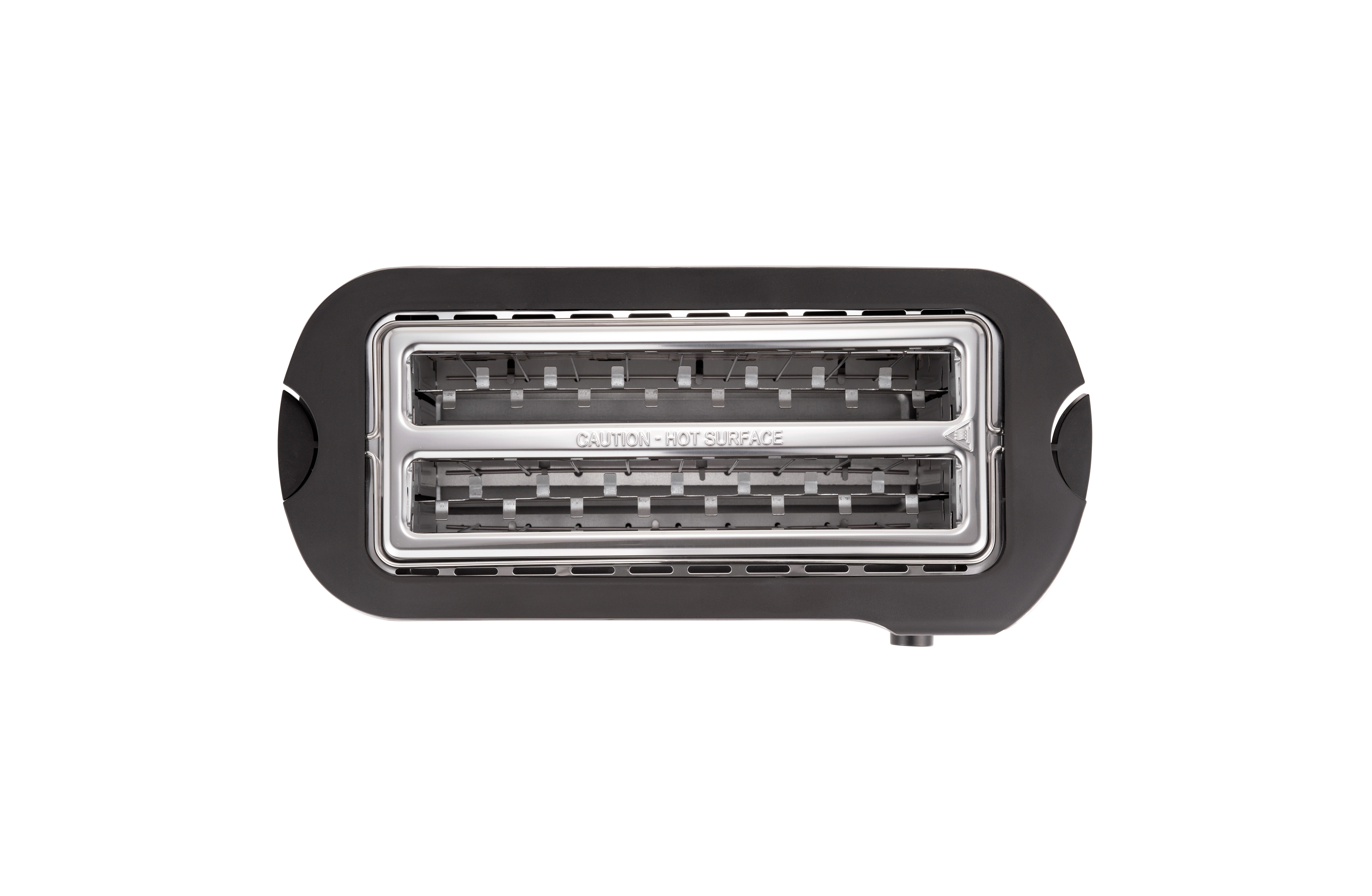 Tostadora doble de diseño elegante con pantalla digital que muestra el tiempo restante y control de tostado en 6 niveles. Práctica y versátil, con funciones de recalentar, descongelar y rejilla para calentar.